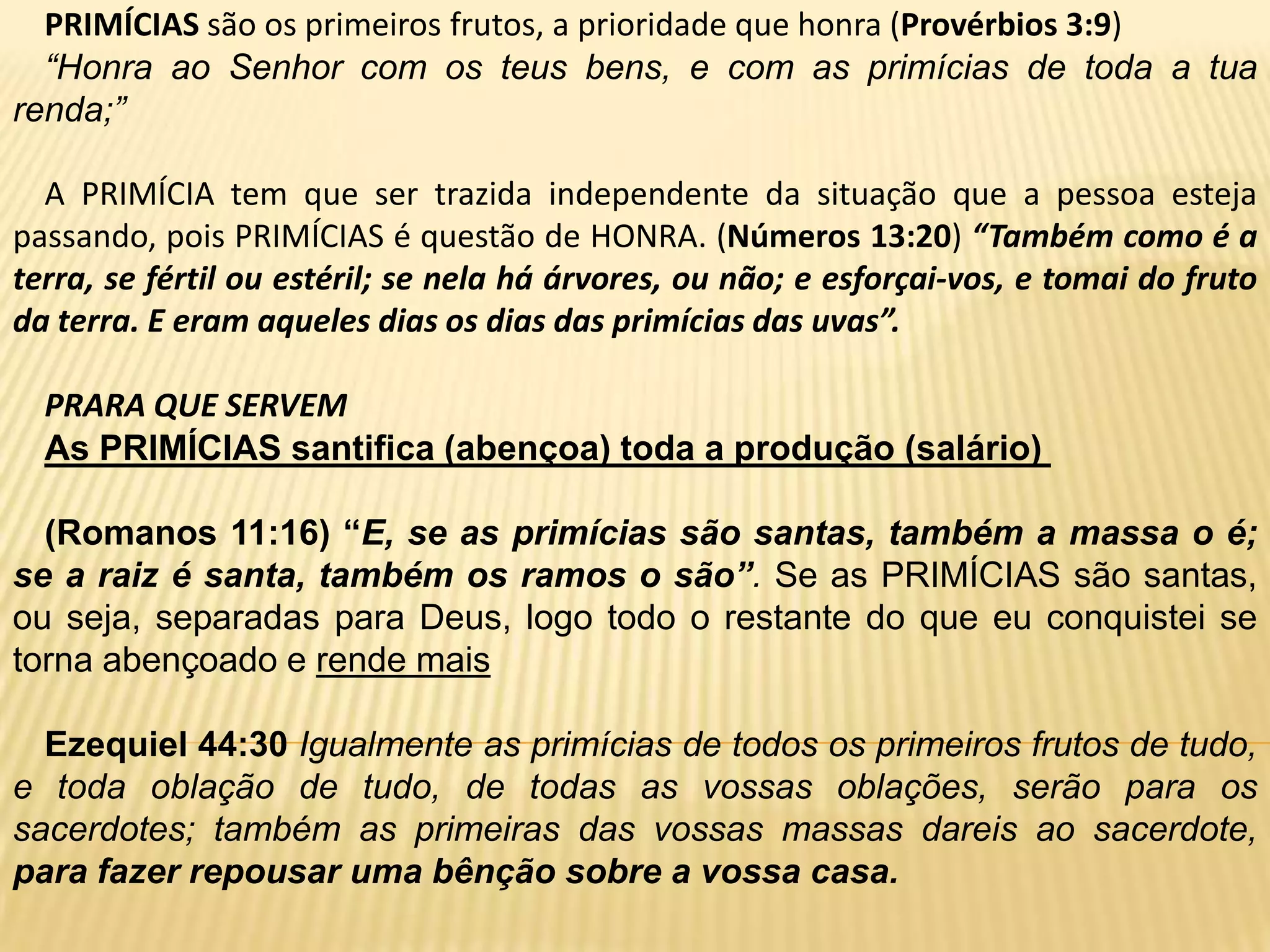 3) As primícias, diferentes dos dízimos, são oferecidas aos sacerdotes como forma de sustento.