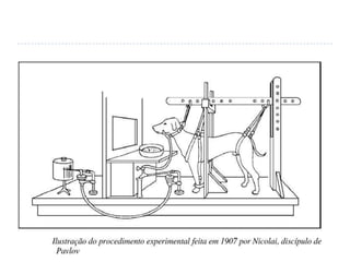 O documento descreve os estudos de Ivan Pavlov sobre condicionamento clássico usando cães. Pavlov observou que os cães salivavam quando recebiam comida (resposta incondicionada), e condicionou-os a salivar ao som de uma campainha, associando o som ao alimento (resposta condicionada). Isso mostrou que os animais podem aprender associações entre estímulos e respostas.