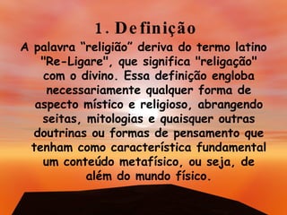 O documento define religião como a ligação com o divino e descreve os dois tipos principais: monoteístas (acreditam em um único Deus) e politeístas (acreditam em vários deuses). Ele fornece um quadro comparando as três principais religiões monoteístas - Judaísmo, Cristianismo e Islamismo - listando suas cidades sagradas, fundadores, livros sagrados e templos.