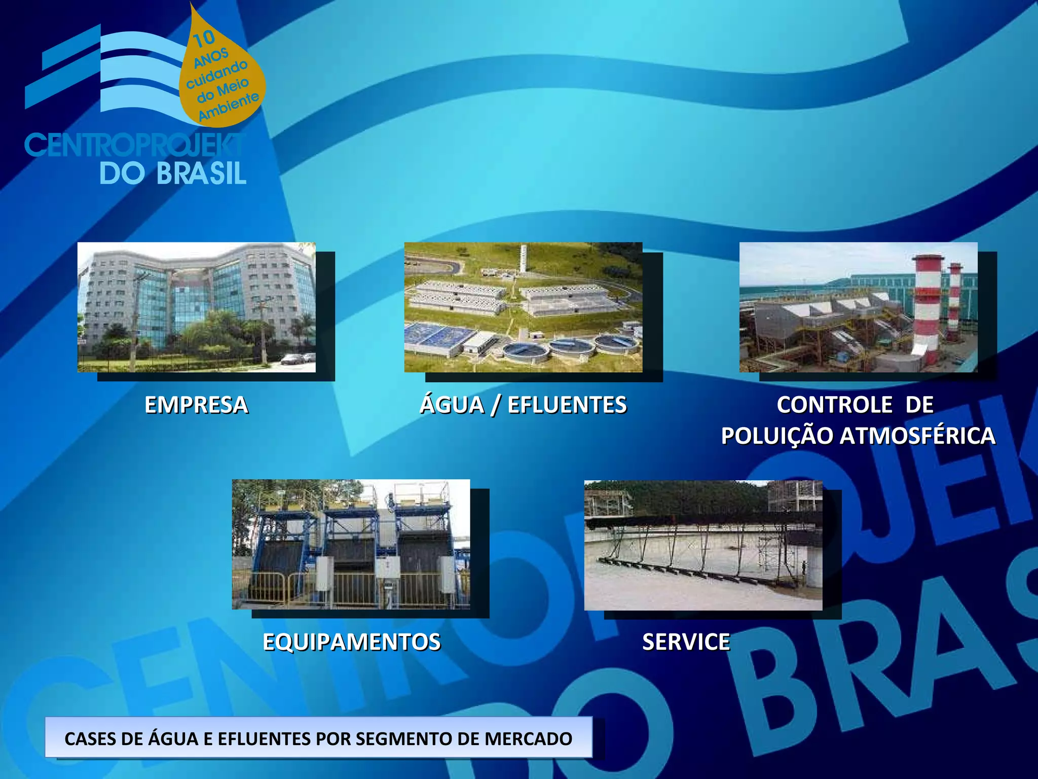 A Centroprojekt do Brasil é uma empresa especializada em engenharia para sistemas de tratamento de água, esgoto sanitário, efluentes industriais e controle de poluição atmosférica. Ela oferece serviços como projetos, fabricação de equipamentos, operação e manutenção. A empresa tem escritórios, filiais e fábrica em São Paulo e representantes em outros estados brasileiros. Seus principais mercados alvos são área pública, indústrias alimentícia, química, de mineração, papel, pet