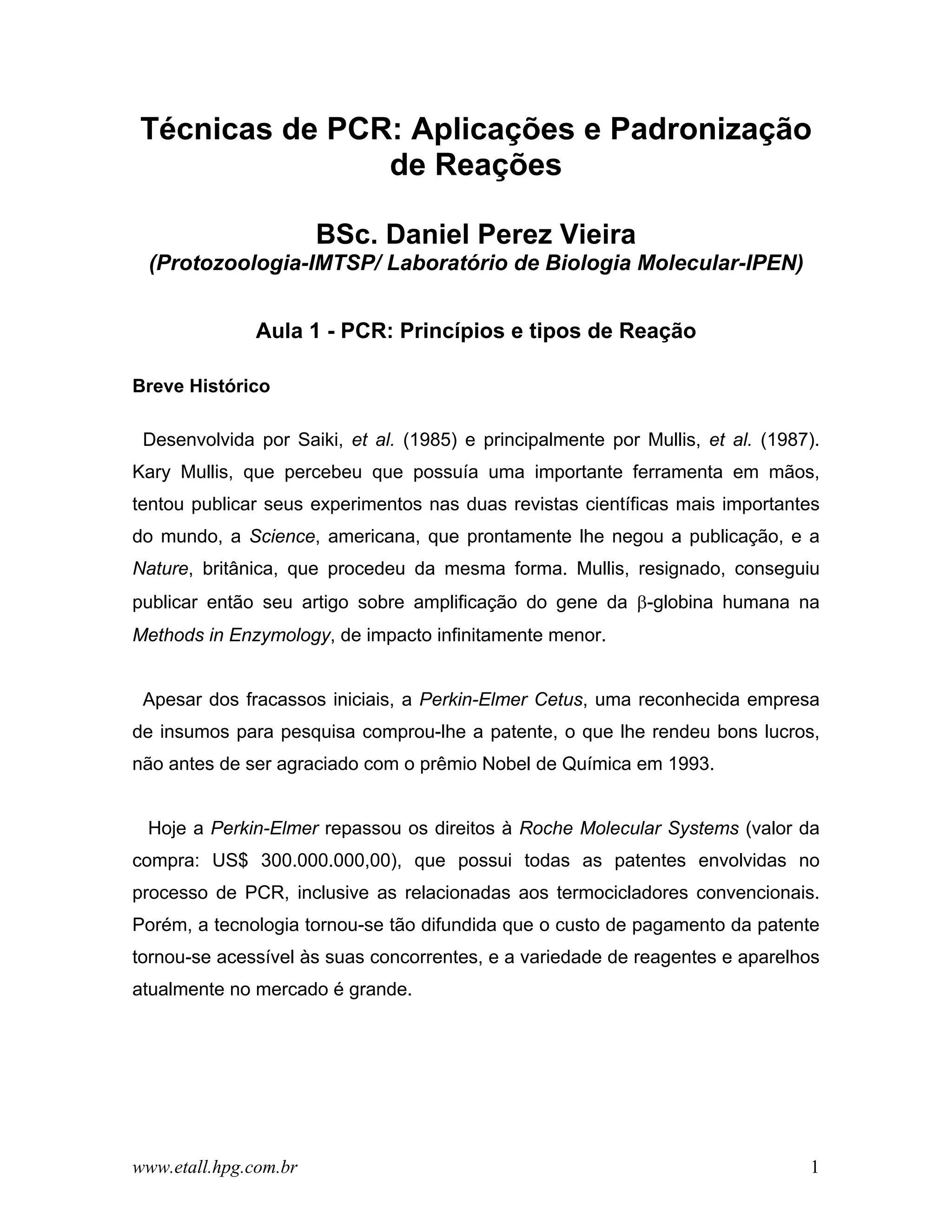 O documento descreve a história e os princípios da reação em cadeia da polimerase (PCR), incluindo seu inventor Kary Mullis. A PCR permite a amplificação seletiva de segmentos específicos de DNA através de ciclos de temperatura que usam primers e DNA polimerase termoestável. Os reagentes e tipos de reações PCR mais comuns são também explicados.