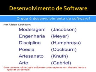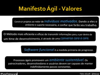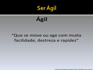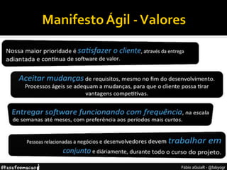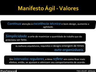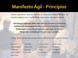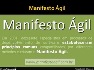 Este documento fornece recursos sobre métodos ágeis de desenvolvimento de software, incluindo links para o Manifesto Ágil, uma introdução aos métodos ágeis por Daniel Cukier e Fabio Aguiar, e detalhes de contato de Diego Lisbôa.