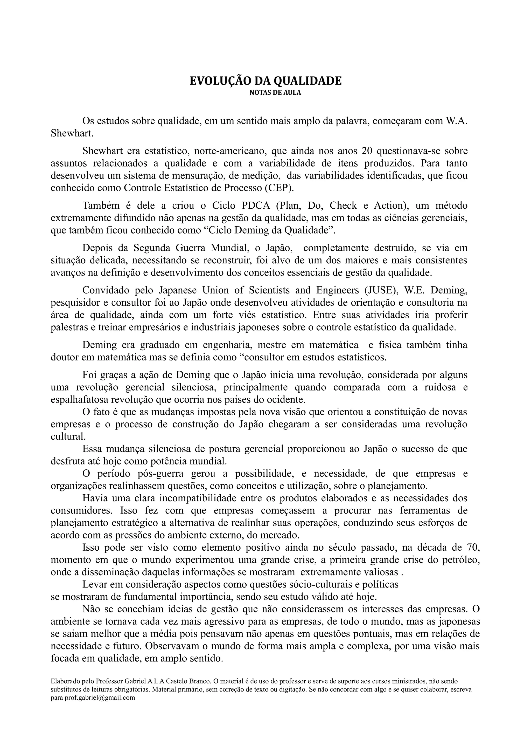 1) Os estudos sobre qualidade começaram com W.E. Deming no Japão pós-guerra, onde ele introduziu o Ciclo PDCA e ajudou a reconstruir a economia japonesa.