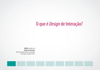 O design de interação envolve a criação de produtos interativos que facilitam as atividades diárias dos usuários, focando na usabilidade e na experiência do usuário. O processo é colaborativo e multidisciplinar, buscando atender as necessidades dos usuários através de um design que evolui com o tempo. Metas como eficácia, segurança e facilidade de aprendizado são essenciais para garantir a satisfação e a adequação dos produtos interativos.