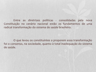 Este documento descreve os princípios e diretrizes do Sistema Único de Saúde brasileiro (SUS). O SUS é baseado nos princípios da universalidade, equidade e integralidade e é organizado segundo os princípios da regionalização, hierarquização, descentralização e participação da comunidade. O setor privado pode complementar o SUS mediante contratos que garantam o cumprimento dos mesmos princípios.