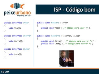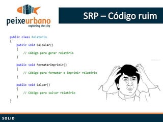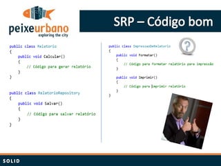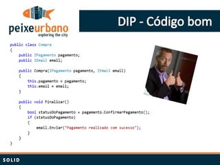 O documento resume princípios de design como SOLID e padrões de projeto. Aborda a importância de estudar constantemente e aplicar boas práticas como responsabilidade única, aberto/fechado, substituição de Liskov e inversão de dependência para projetar software de forma limpa e mantível.