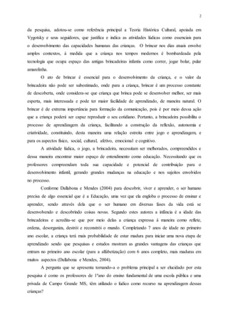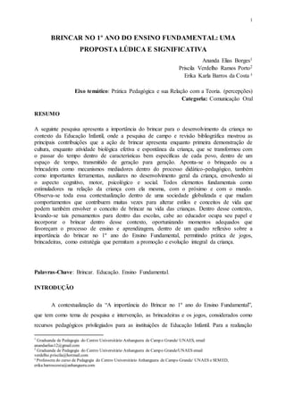 Este documento discute a importância do brincar no desenvolvimento infantil, especialmente no contexto do 1º ano do ensino fundamental. A pesquisa enfatiza que brincadeiras e jogos são ferramentas pedagógicas essenciais que promovem o crescimento cognitivo, motor e social das crianças, mas observou-se que nas escolas muitas vezes o brincar é relegado a segundo plano em favor de métodos tradicionais de ensino. Os resultados indicam que é crucial para educadores integrar atividades lúdicas no processo de ensino-aprendizagem para potencializar o desenvolvimento integral das crianças.