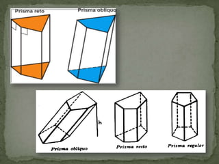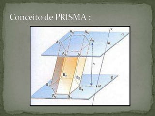 O documento descreve os tipos de poliedros convexos conhecidos como prismas, incluindo suas características geométricas, exemplos de prismas triangulares, quadrangulares e hexagonais, e fórmulas para calcular a área total, área da base, área lateral e volume de prismas.