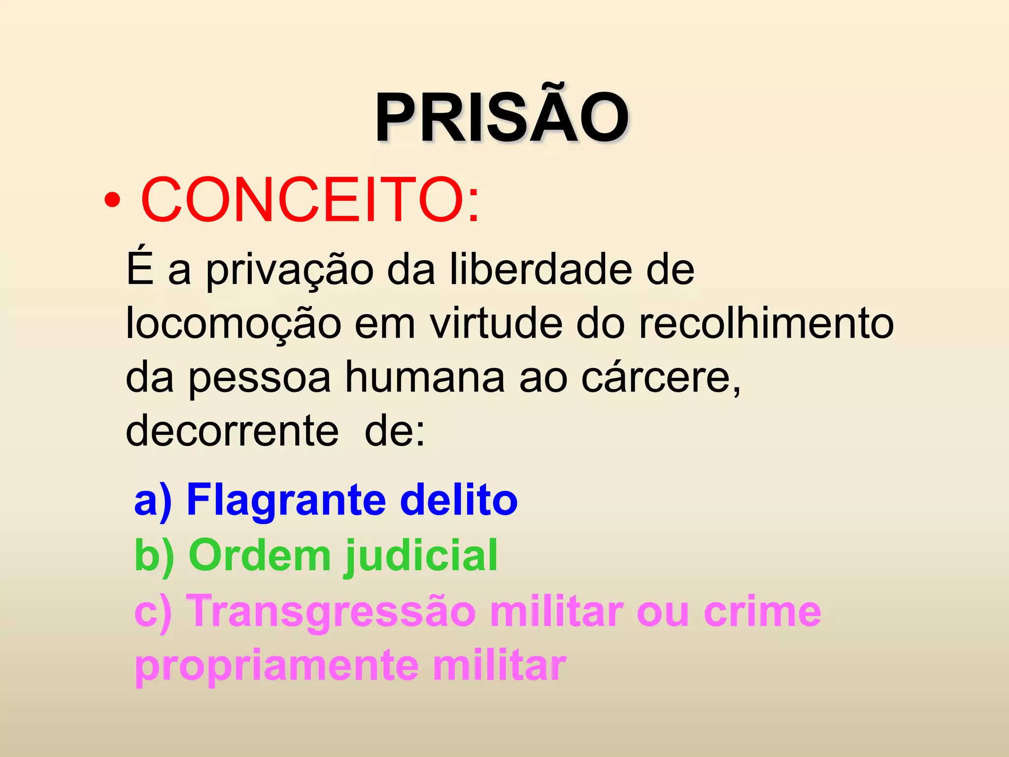 O documento discute os conceitos e espécies de prisão no direito brasileiro. Resume que a prisão é a privação da liberdade de locomoção em virtude do recolhimento da pessoa ao cárcere, podendo ocorrer em flagrante delito, por ordem judicial ou por transgressão militar. As espécies de prisão incluem prisão extra-penal (civil, administrativa ou disciplinar) e prisão penal ou cautelar antes do trânsito em julgado da sentença condenatória. A prisão em flagrante pode ser relax