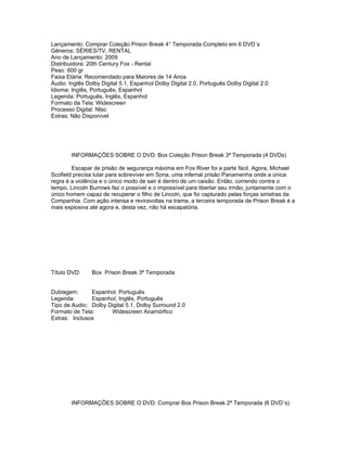 O documento descreve três coleções de DVDs da série de TV Prison Break. Ele fornece detalhes sobre os idiomas, legendas, formato de tela e extras incluídos nas coleções da 1a, 2a e 3a temporada.
