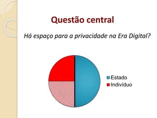 O documento discute a relação entre privacidade, transparência pública e o impacto das tecnologias digitais na vida dos indivíduos, enfatizando a dificuldade em proteger informações pessoais na era da informação. Aborda a emergência de novas gerações que, imersas em ambientes digitais, têm suas percepções de privacidade alteradas e expostas a um sistema de vigilância crescente. Conclui que, apesar dos desafios apresentados, ainda há possibilidade de manter a privacidade, desde que haja reflexão e ação crítica sobre os efeitos das tecnologias informacionais.