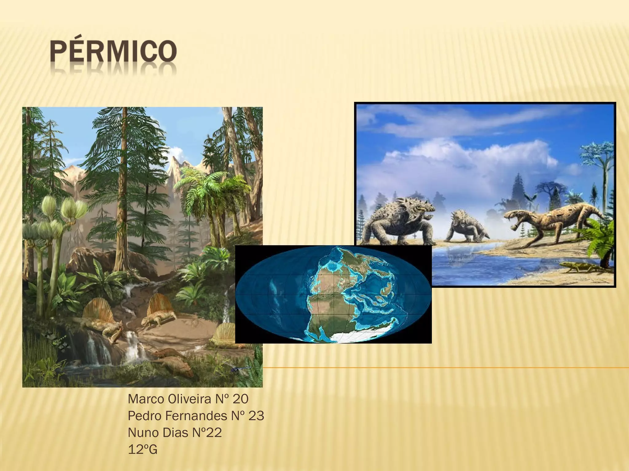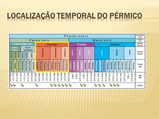 O documento resume o período geológico do Pérmico, incluindo a morfologia dos continentes, clima e ambiente, fauna e flora características, e a grande extinção em massa no final do período que eliminou cerca de 95% da vida na Terra.