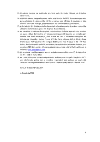 1. O prémio SPCE/De Facto Editores tem como objetivo estimular a qualidade da investigação nas ciências da educação em Portugal, através da publicação do melhor trabalho submetido.