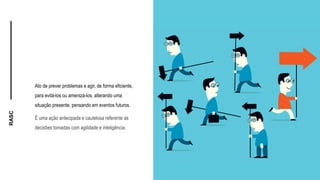 O documento discute o conceito de proatividade no ambiente de trabalho. A proatividade é definida como agir de forma antecipada para evitar ou amenizar problemas, pensando em eventos futuros. Pessoas proativas buscam ativamente oportunidades de mudança e melhoria contínua. Empresas valorizam a proatividade dos funcionários pois está associada a maior produtividade e competitividade da organização.
