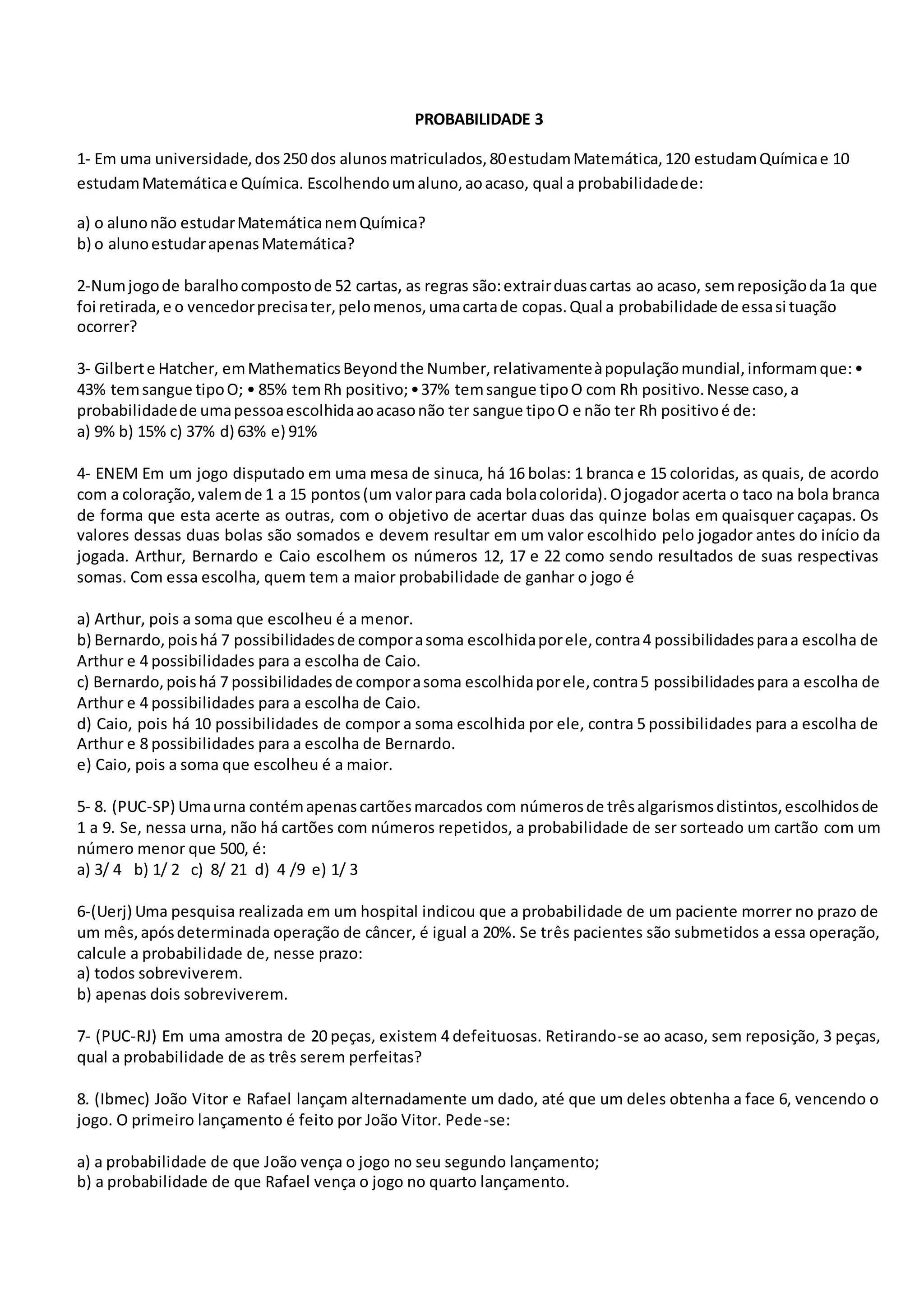 1. O documento apresenta 15 problemas de probabilidade envolvendo situações como sorteio de alunos, cartas, sangue, números em cartões e bolas em urnas. Os problemas abordam cálculo de probabilidades condicionais e probabilidades de eventos compostos.