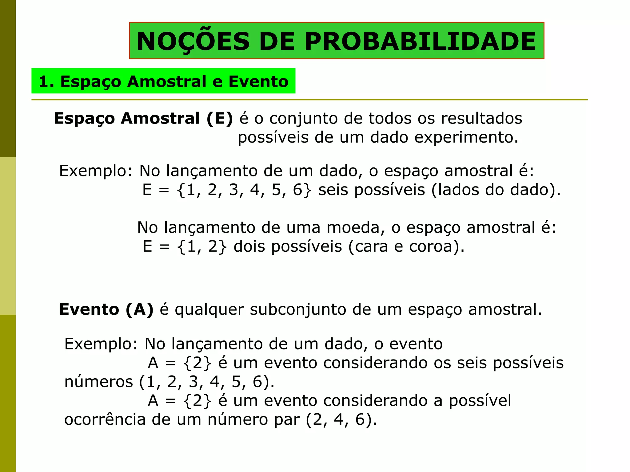 O documento discute noções básicas de probabilidade, incluindo: 1) Definição de espaço amostral e evento; 2) Definição formal de probabilidade como a razão entre o número de elementos do evento e o número total de elementos do espaço amostral; 3) Exemplos de cálculo de probabilidades para lançamento de dados, sorteios numéricos e retirada de bolas de urnas.