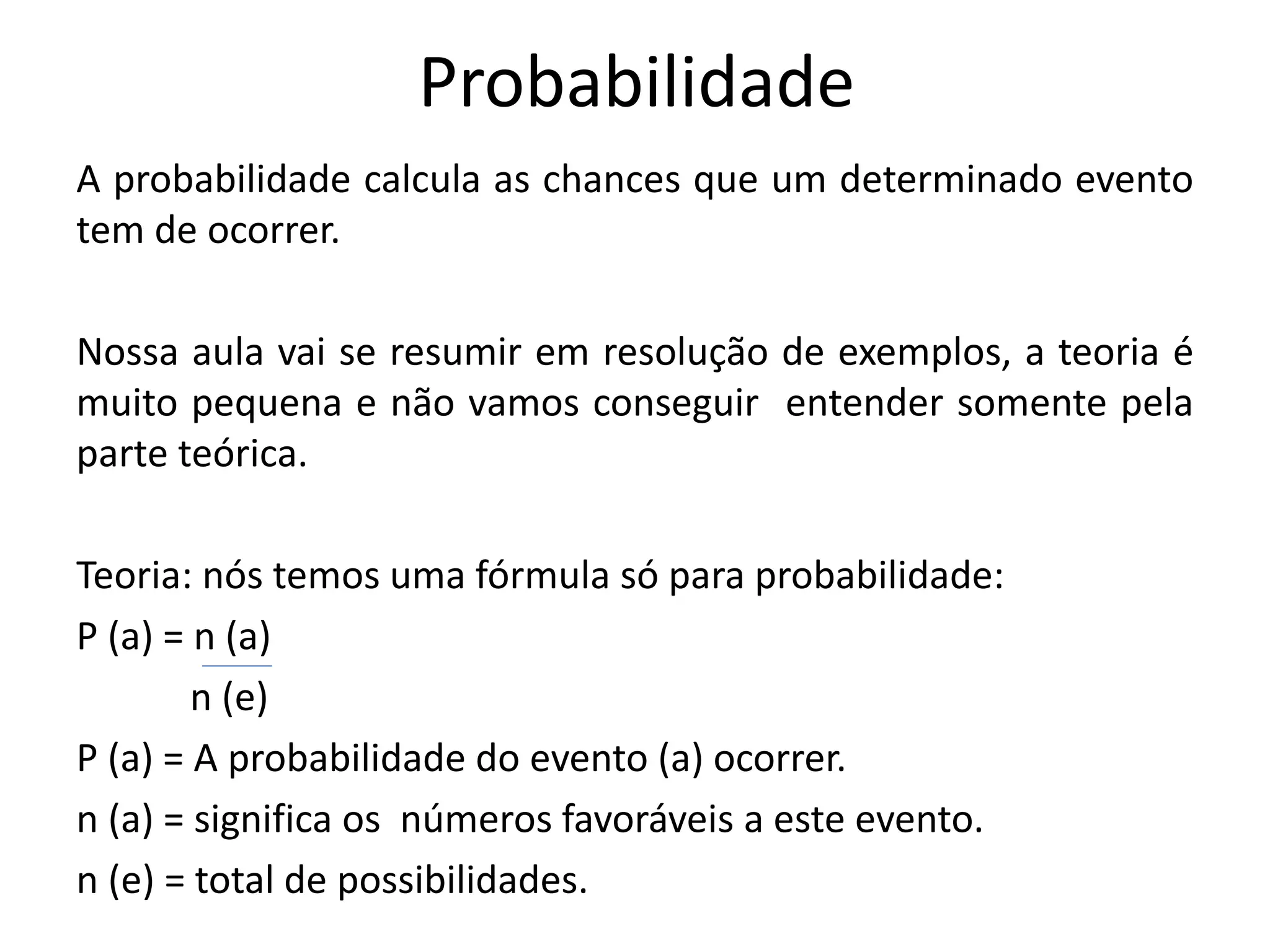 A probabilidade calcula as chances de um evento ocorrer. A teoria é breve e os exemplos são essenciais para entendimento. A fórmula básica é P(a) = n(a)/n(e), onde P(a) é a probabilidade do evento a ocorrer, n(a) os casos favoráveis e n(e) o total de possibilidades.