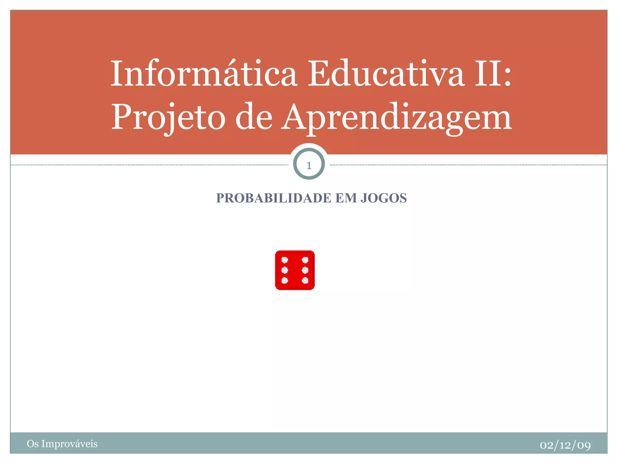 Este projeto visa ensinar probabilidade para alunos do 2o ano do ensino médio utilizando jogos como xadrez e dados. Serão realizadas seis aulas introduzindo o tema, fazendo atividades práticas com objetos, jogando xadrez, utilizando jogos de computador e resolvendo problemas. O objetivo é desenvolver raciocínio lógico e habilidades matemáticas dos alunos de forma lúdica.