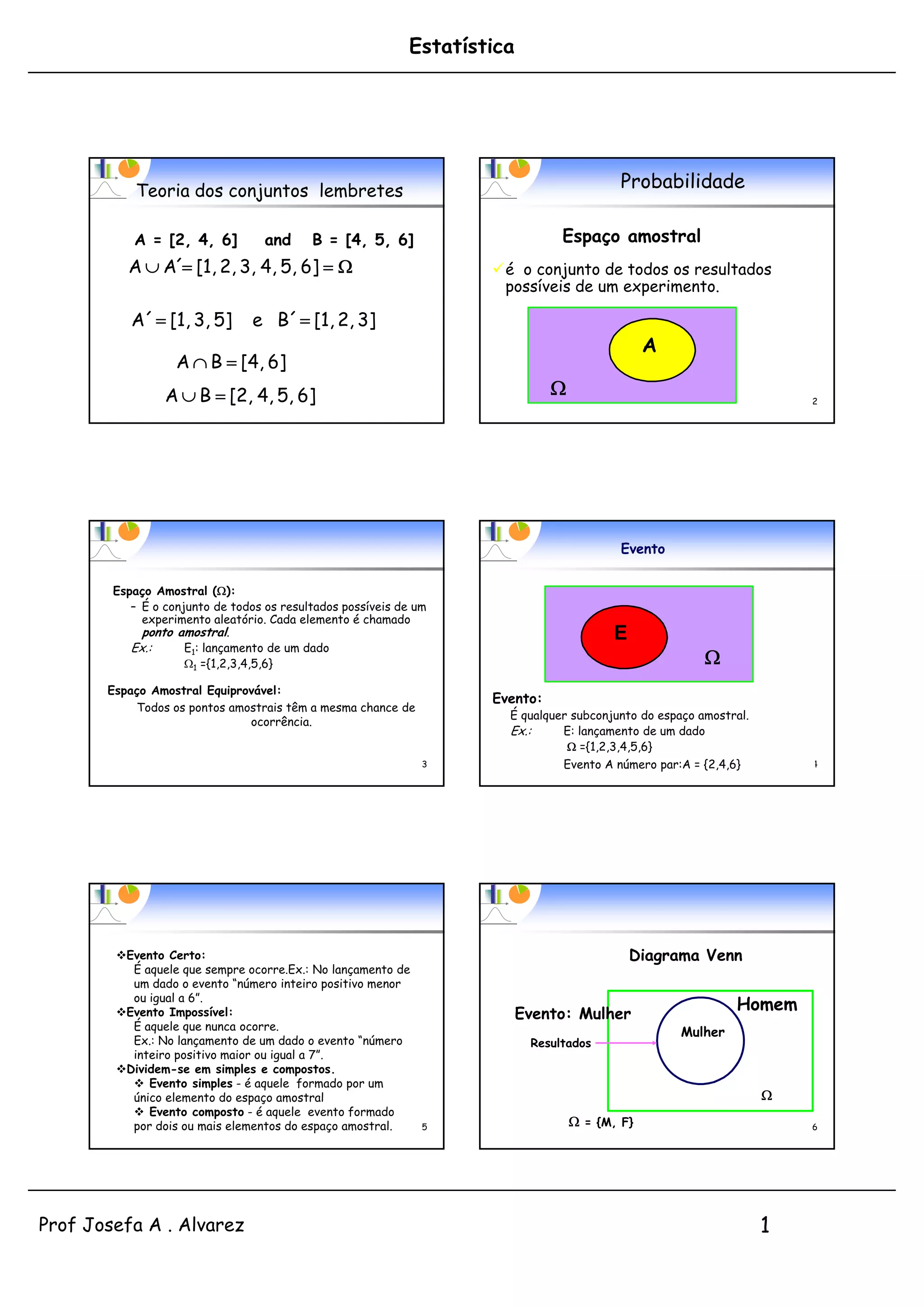 1) Definição de espaço amostral como o conjunto de todos os resultados possíveis de um experimento aleatório e evento como qualquer subconjunto do espaço amostral;