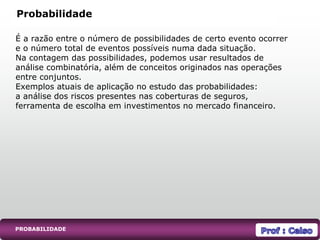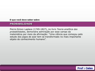 Pierre-Simon Laplace considerou a probabilidade como o campo mais importante do conhecimento humano. A probabilidade é a razão entre o número de possibilidades de um evento ocorrer e o número total de eventos possíveis. Exemplos atuais de aplicação da probabilidade incluem análise de riscos em seguros e investimentos financeiros.