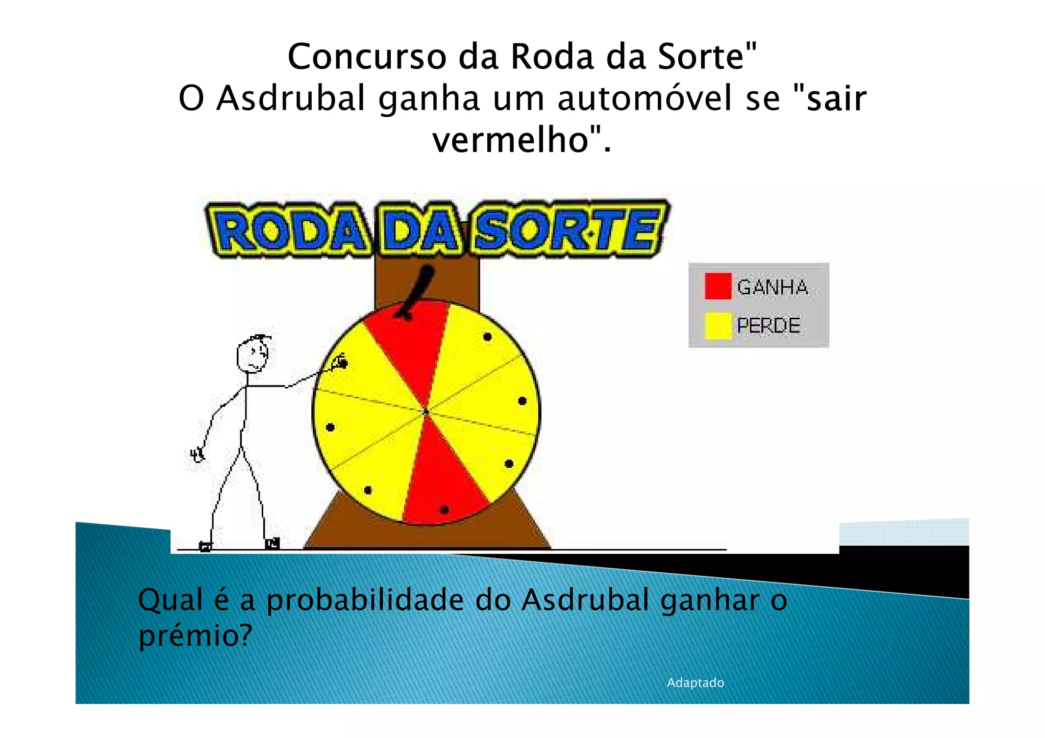 O documento descreve vários exemplos de probabilidade em eventos de sorteio, incluindo: (1) a probabilidade de ganhar um carro em uma roleta com 2 setores vermelhos de um total de 8 é de 1/4; (2) a probabilidade de empatar em uma roleta de 8 setores é impossível; (3) a probabilidade de tirar uma letra ou consoante em sorteios variáveis.