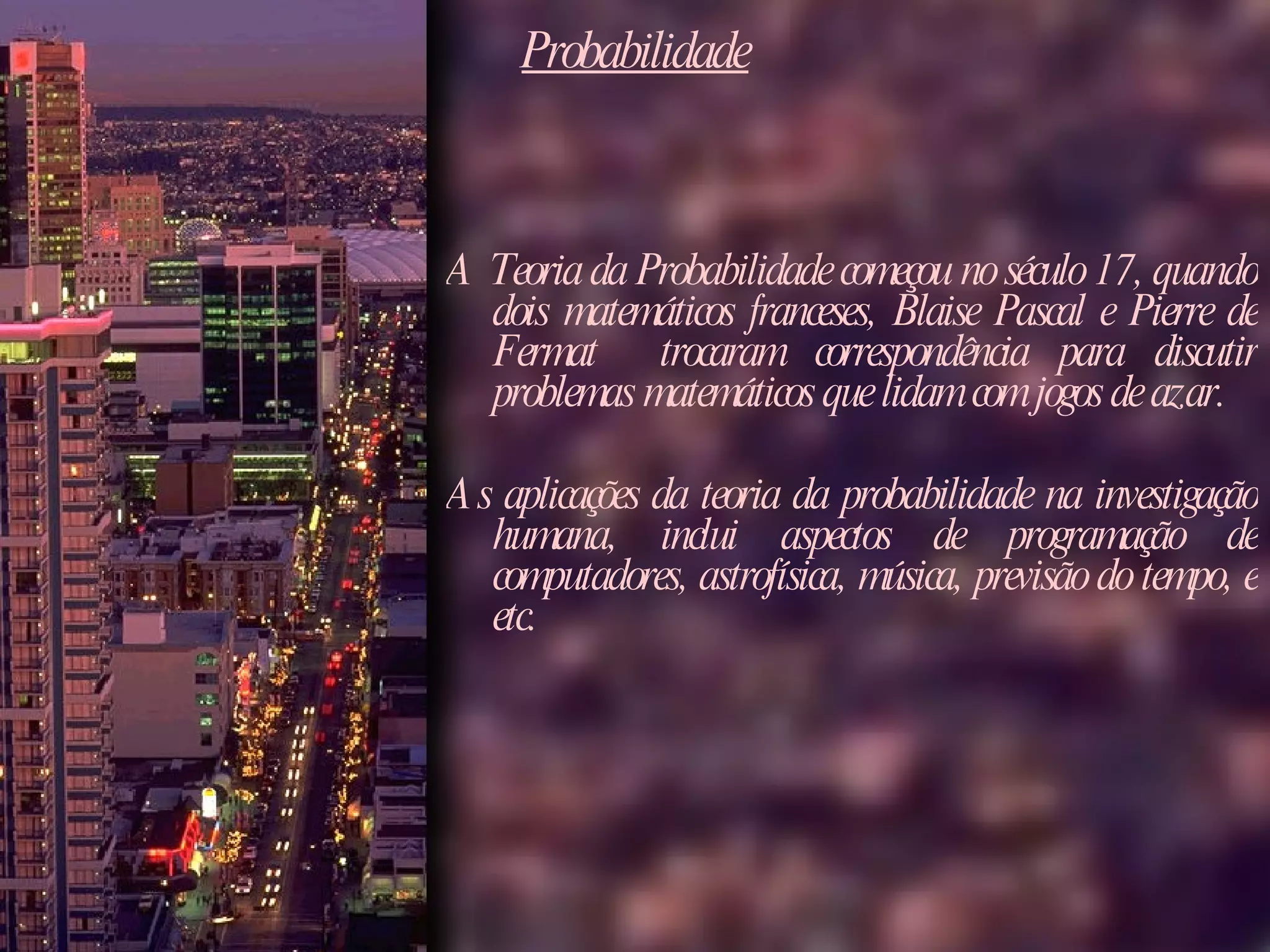 1) A teoria da probabilidade começou no século 17 com discussões entre Pascal e Fermat sobre jogos de azar.