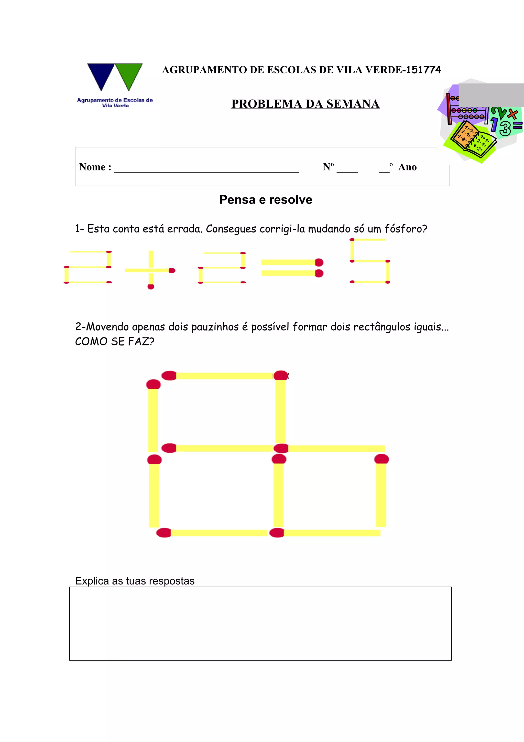 Este documento apresenta dois problemas matemáticos para estudantes resolvere: (1) corrigir uma conta errada movendo apenas um fósforo e (2) formar dois retângulos iguais movendo apenas dois pauzinhos. Os estudantes devem explicar suas respostas.