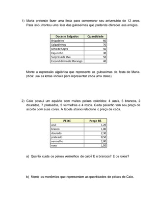 Maria planeja uma festa de aniversário de 12 anos e preparou uma lista com 60 brigadeiros, 70 salgadinhos, 50 olhos de sogra, 30 cajuzinhos, 50 surpresas de uva, 40 escondidinhos de morango. A expressão algébrica que representa as guloseimas é B60+S70+O50+C30+U50+M40.