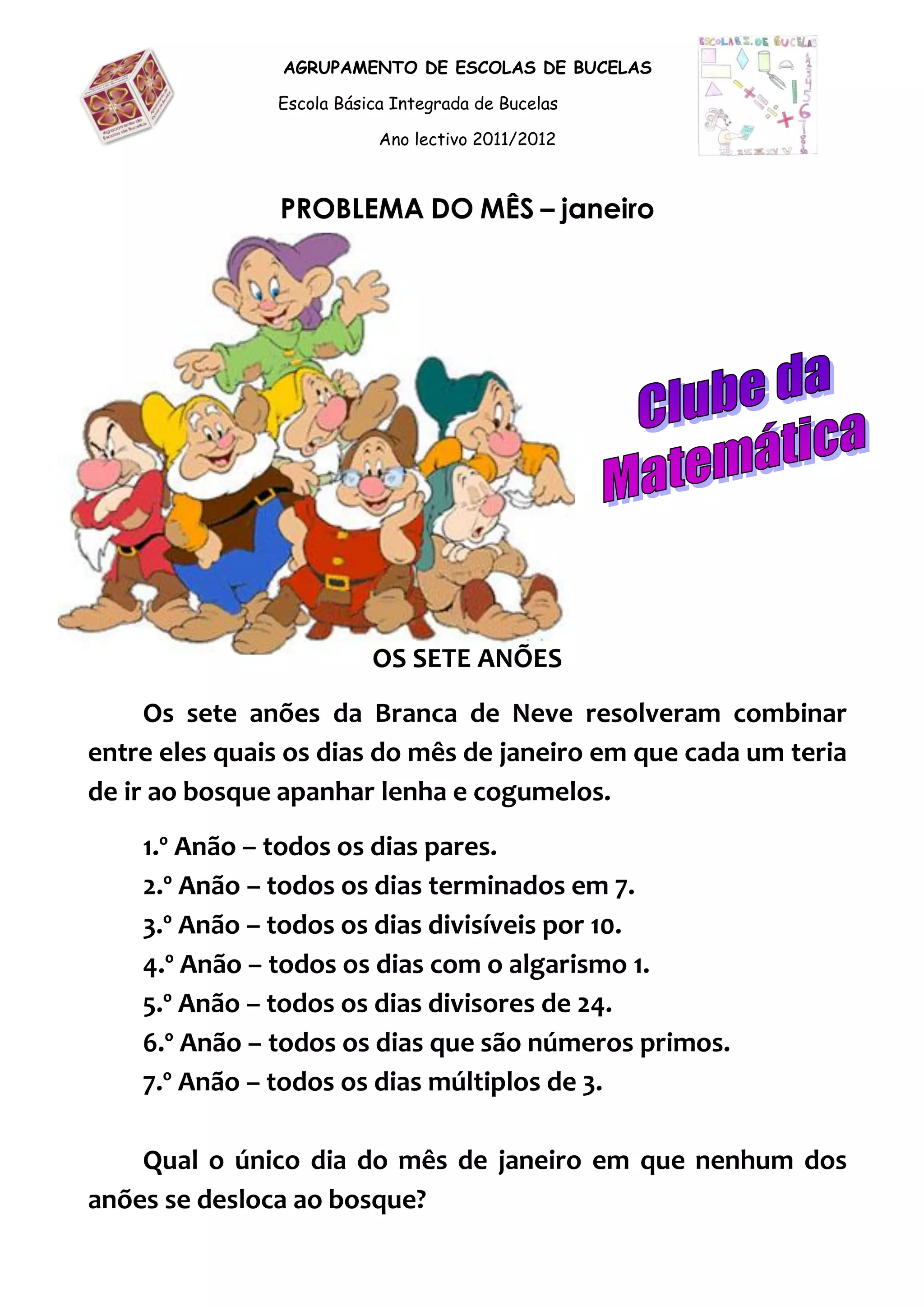 O texto descreve um problema envolvendo os sete anões da Branca de Neve, onde cada anão é responsável por coletar lenha e cogumelos em dias específicos do mês de janeiro. O problema pede para identificar o único dia do mês onde nenhum dos anões precisa ir ao bosque.