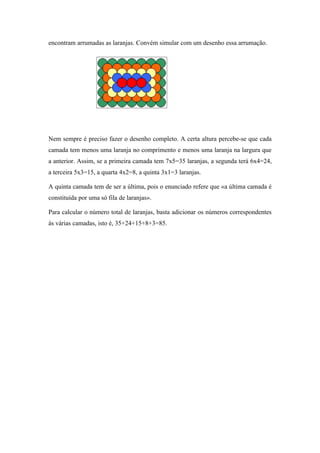 O documento descreve um problema matemático sobre uma pilha de laranjas arrumadas em camadas retangulares de tamanho decrescente. A primeira camada tem 5 laranjas de comprimento por 7 de largura, totalizando 35 laranjas, e cada camada subsequente tem 1 laranja a menos em cada dimensão. A soma das laranjas de todas as camadas é 85 laranjas.