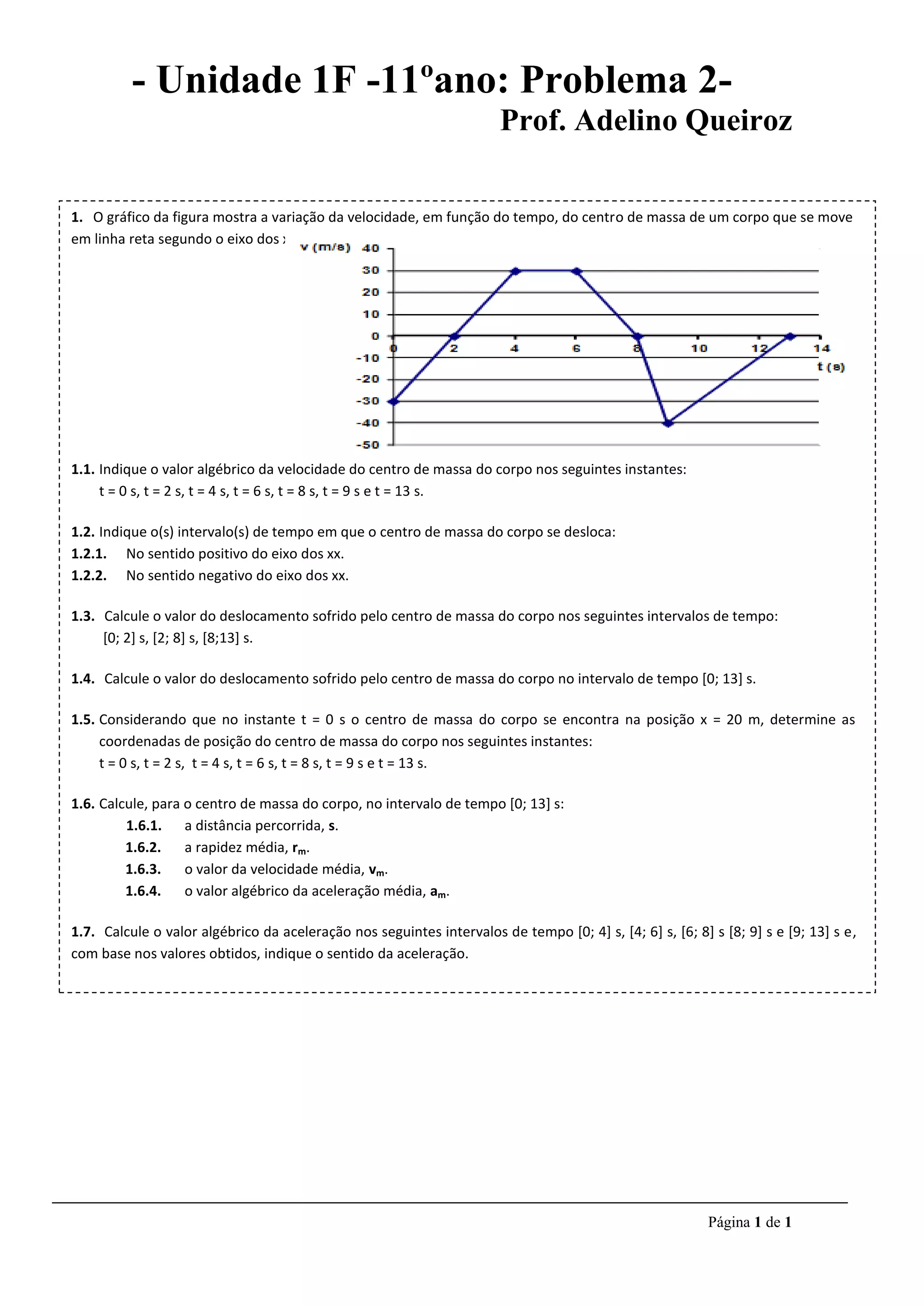 O documento apresenta um gráfico da velocidade em função do tempo de um corpo em movimento retilíneo. São solicitados cálculos de velocidade, deslocamento, coordenadas de posição, distância percorrida, velocidade média e aceleração média no intervalo de 0 a 13 segundos.