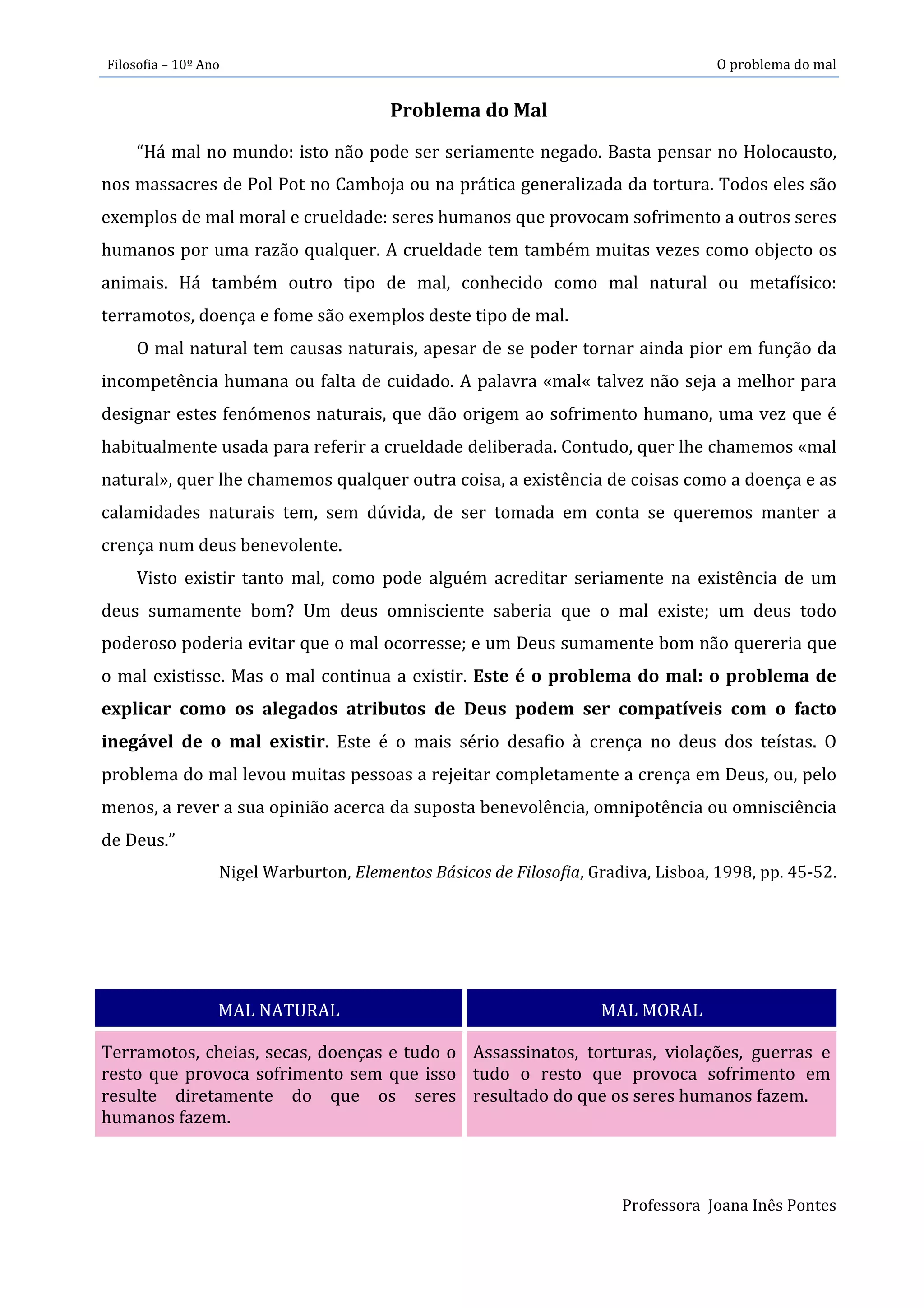 O documento discute o problema do mal, definindo mal moral como sofrimento causado intencionalmente por humanos e mal natural como sofrimento causado por fenômenos naturais. A existência de tanto mal moral e natural levanta questões sobre como a crença em um deus onipotente, onisciente e benevolente pode ser compatível com a realidade do sofrimento no mundo.