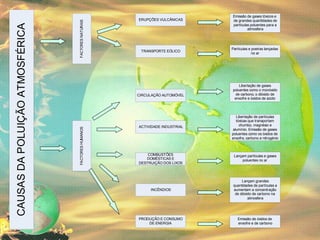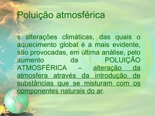 O documento discute vários problemas ambientais, incluindo poluição atmosférica, efeito estufa, aquecimento global, desflorestação, degradação dos solos, produção de resíduos, perda de biodiversidade, poluição das águas e causas da poluição oceânica.