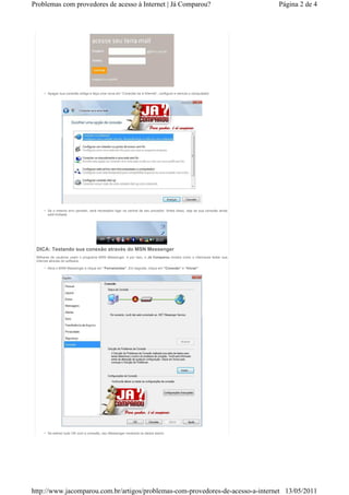 O documento discute problemas comuns com provedores de internet e formas de diagnosticá-los e resolvê-los, incluindo verificando as configurações de login e senha, reiniciando a conexão, e testando a velocidade da conexão usando o MSN Messenger. Recomenda-se entrar em contato com o provedor se os problemas persistirem.
