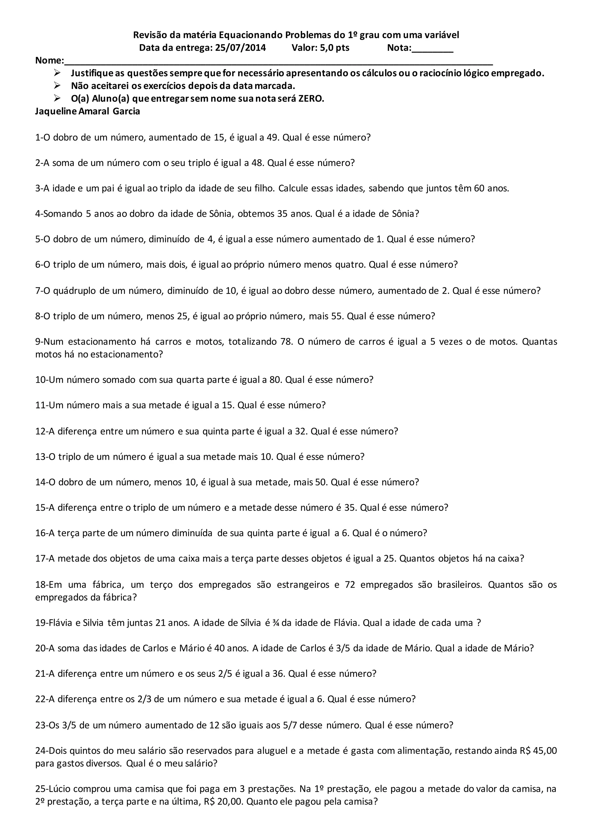 1. O documento apresenta 50 exercícios de matemática do 1o grau com uma variável.