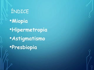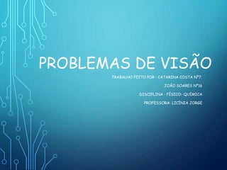 [1] O documento discute vários problemas de visão como miopia, hipermetropia, astigmatismo e presbiopia. [2] A miopia ocorre quando a imagem se foca à frente da retina, a hipermetropia quando se foca atrás da retina, e o astigmatismo quando a córnea tem forma oval. [3] Esses problemas são corrigidos com lentes apropriadas como lentes côncavas, convexas ou cilíndricas.