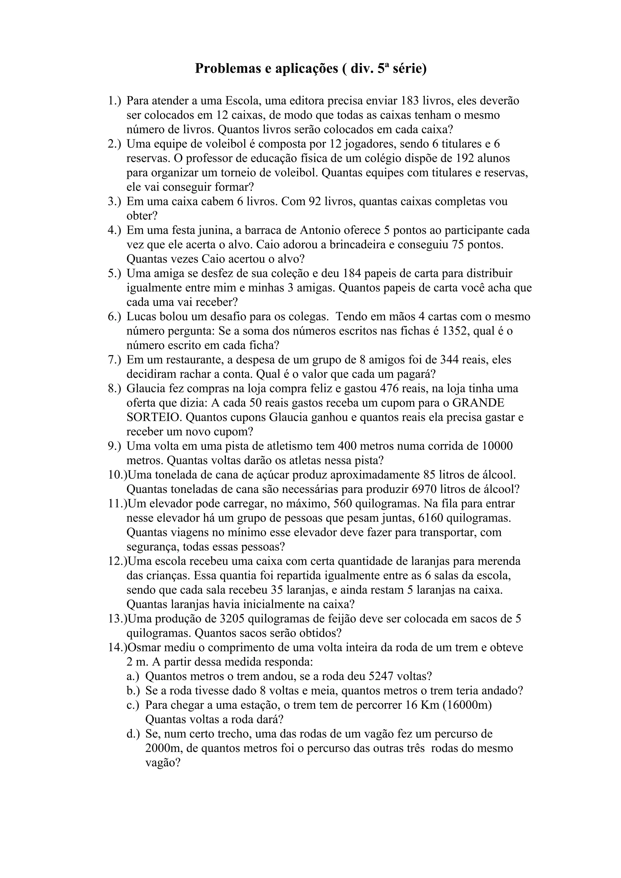 O documento apresenta 14 problemas matemáticos envolvendo cálculos de divisão, multiplicação, porcentagem e outras operações. Os problemas abordam temas como distribuição de livros em caixas, formação de times de vôlei, quantidades de cupons ganhos em compras, distâncias percorridas por trens e mais.