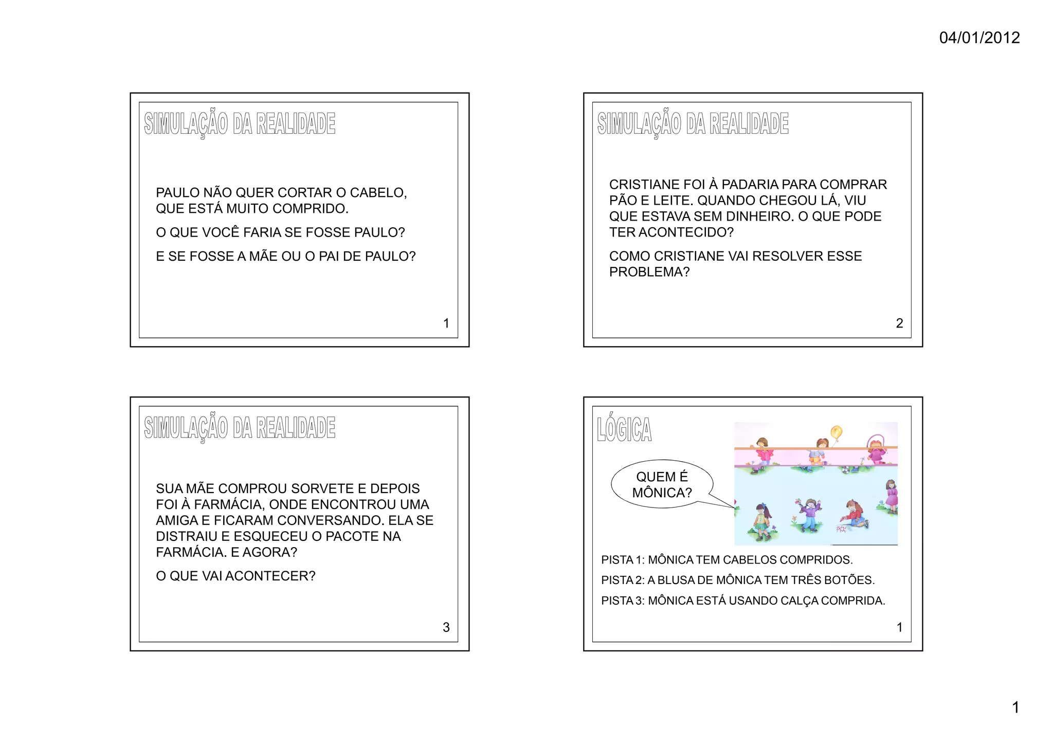 3) Mônica é uma pessoa com cabelos compridos, blusa de três botões e calça comprida.