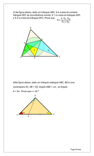 O documento contém 8 problemas geométricos envolvendo triângulos, círculos e quadriláteros. Cada problema fornece uma figura geométrica com ângulos e segmentos identificados e pede para provar uma propriedade geométrica relacionada aos elementos dados.