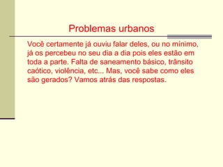 1) Os principais problemas urbanos são gerados pelo crescimento desordenado das cidades e falta de planejamento do Estado;