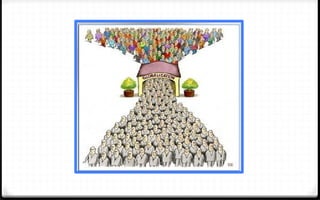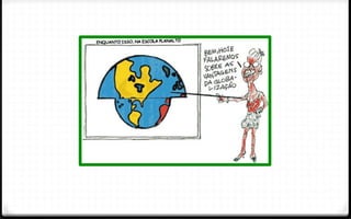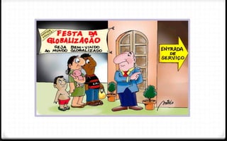 O documento discute a globalização e seus efeitos sociais. Apresenta a definição de globalização como o processo de integração dos povos e sociedades que começou com as grandes navegações e a revolução industrial e que hoje conecta o mundo através de fluxos de pessoas, bens e ideias. Também discute o conceito de "aldeia global" proposto por McLuhan para descrever como a comunicação de massa aproxima as sociedades.