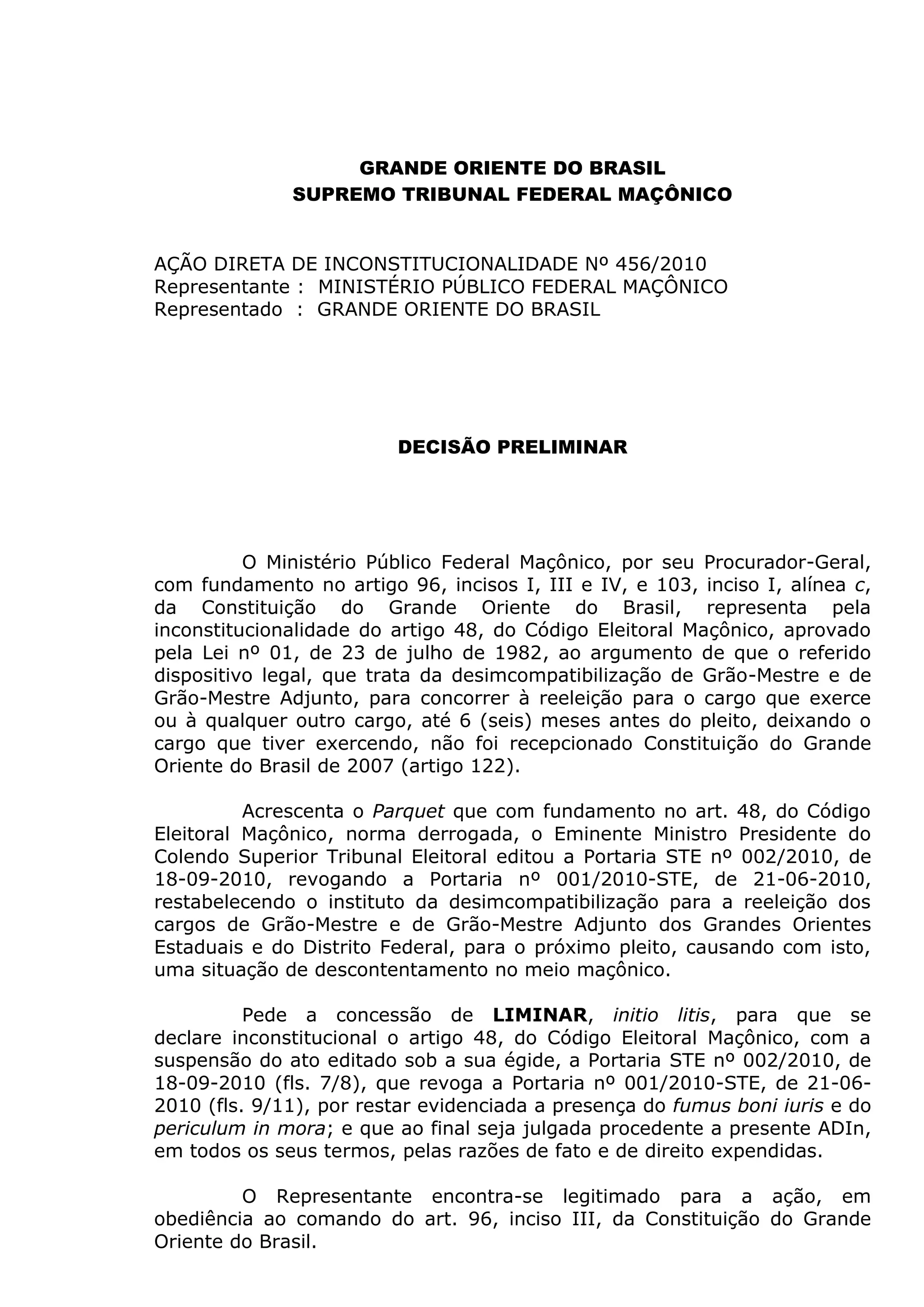 O Ministério Público Federal Maçônico representa pela inconstitucionalidade do artigo 48 do Código Eleitoral Maçônico, que trata da desimcompatibilização para reeleição. O Vice-Presidente do Supremo Tribunal Federal Maçônico concede liminar suspendendo a vigência do artigo 48 e da Portaria STE 002/2010 até julgamento final, uma vez que o artigo 48 não foi recepcionado pela Constituição de 2007. Determina também notificações e publicações sobre a decisão.