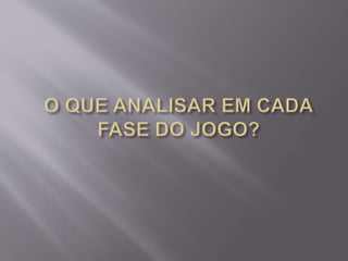 O documento descreve as principais fases da análise tática de futebol: organização defensiva, organização ofensiva, transições e bolas paradas. Ele explica como cada fase será analisada em termos de comportamento, estrutura e qualidade, dependendo do modelo de jogo da equipe.