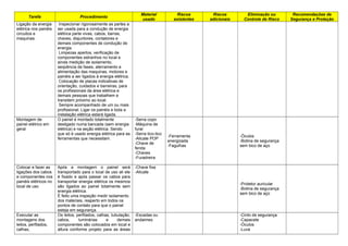 1) O documento descreve procedimentos de segurança para trabalhos elétricos, incluindo a montagem de painéis, instalações elétricas, ligação de energia e montagem de subestações.