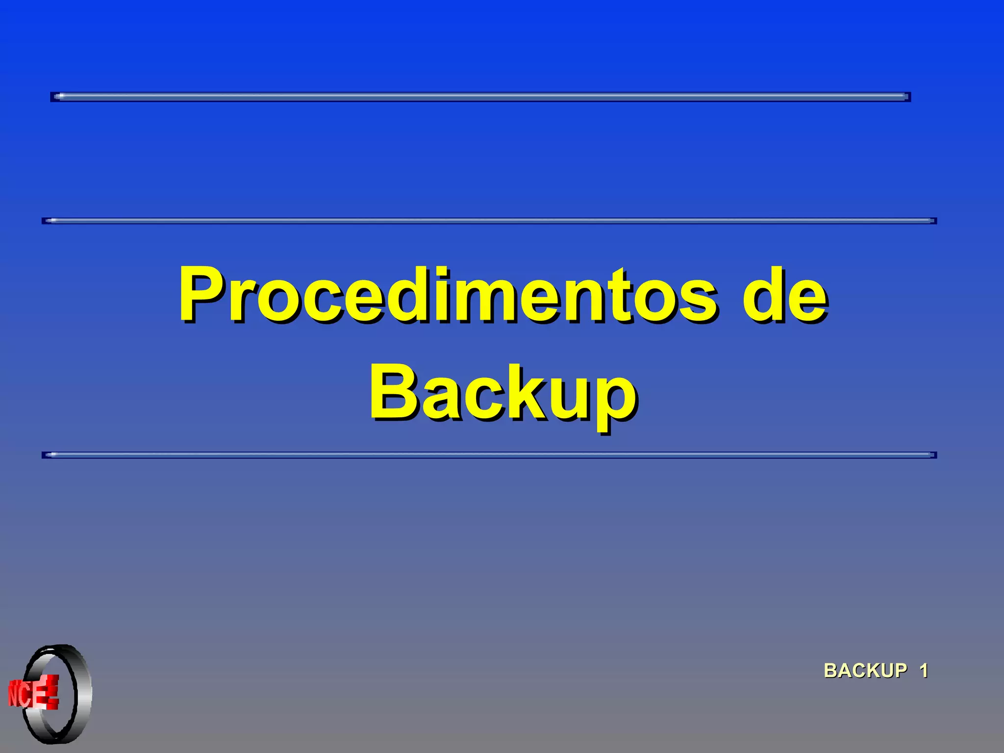 O documento discute procedimentos de backup, incluindo a necessidade de backups, planejamento de backups, tipos de backups completos e incrementais, ferramentas de backup como tar e dump, mídias de backup como fitas e discos, e dicas para executar backups efetivos.