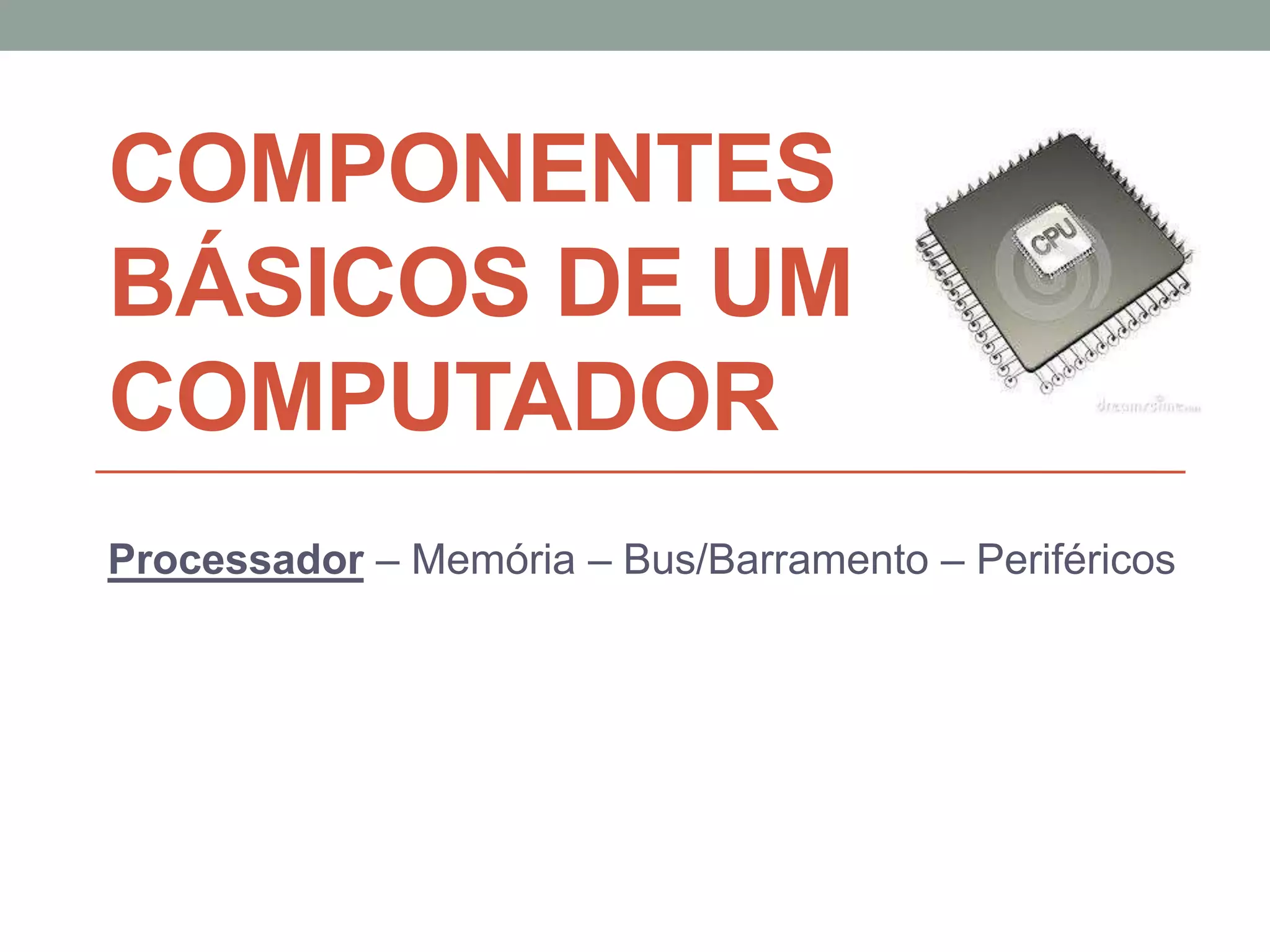 O documento descreve os componentes básicos de um computador: o processador, a memória, os periféricos e o barramento. O processador executa os programas e faz os cálculos, a memória armazena programas e dados, os periféricos permitem a entrada e saída de dados e o barramento conecta esses componentes.