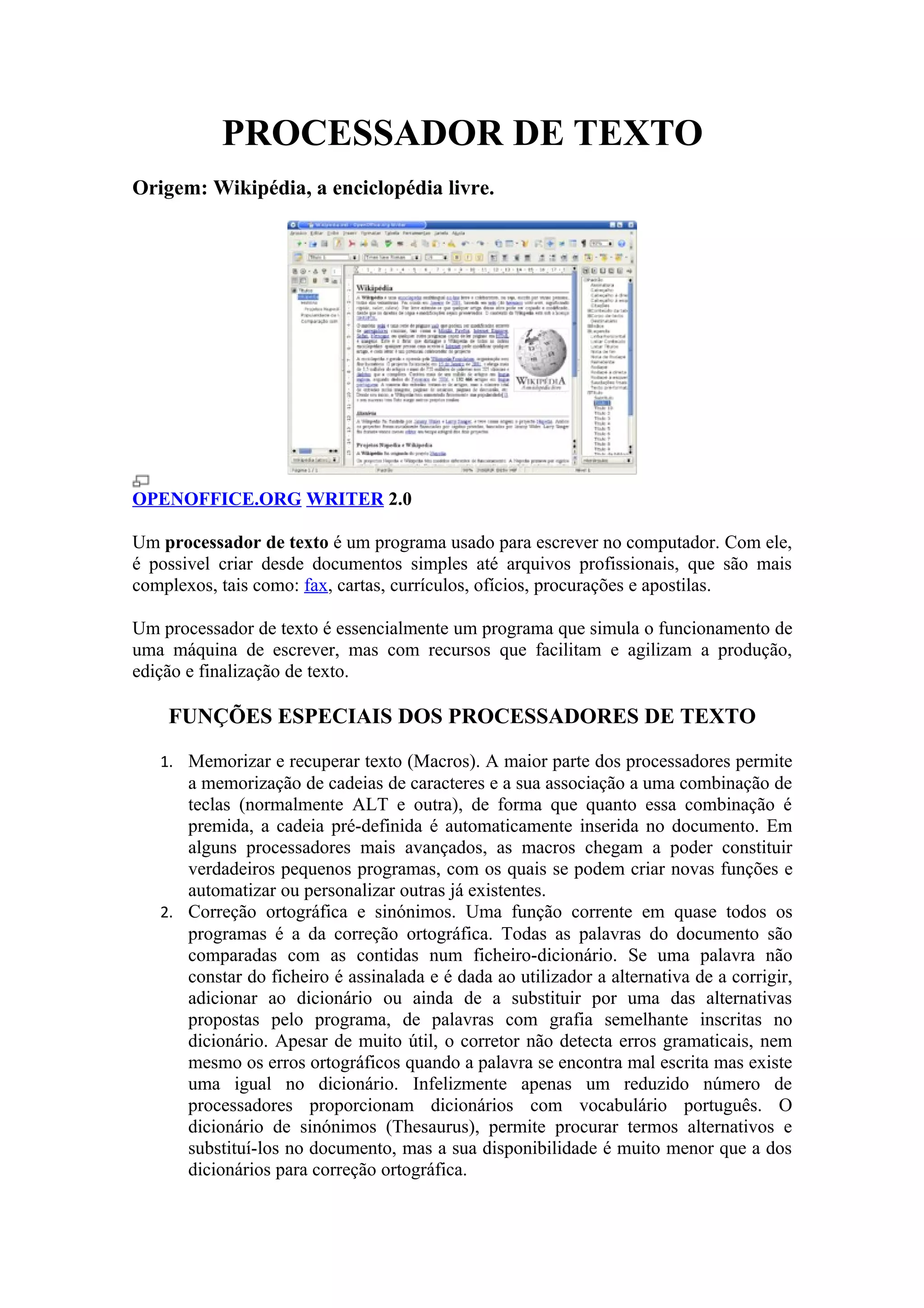O documento descreve as principais funções de um processador de texto, incluindo edição, formatação, inserção de gráficos e tabelas. Também lista alguns dos processadores de texto mais populares, distinguindo entre aqueles de código aberto e proprietários.