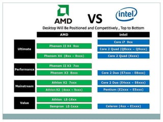 O documento descreve as principais características e funções de um processador, incluindo que é um circuito integrado que realiza cálculos e tomadas de decisão em um computador, e discute os principais fabricantes de processadores como Intel, AMD e IBM.