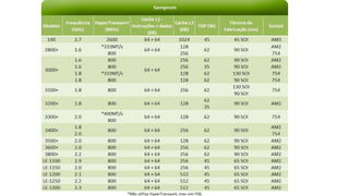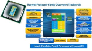 O documento descreve as especificações técnicas dos processadores Haswell da Intel, incluindo o número de núcleos, caches e GPUs. Também fornece uma breve história dos processadores da AMD, desde o K5 até o Phenom, e links para os produtos atuais de ambas as empresas.