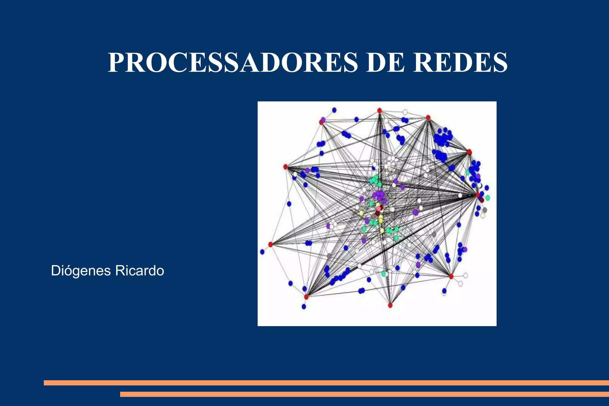 O documento discute processadores de redes e o processamento de pacotes. Ele introduz conceitos como LAN, Ethernet, WAN e Firewall. Também descreve componentes de processadores de redes como ASIC, FPGA, SRAM e SDRAM, além das funções de processamento de entrada e saída de pacotes.